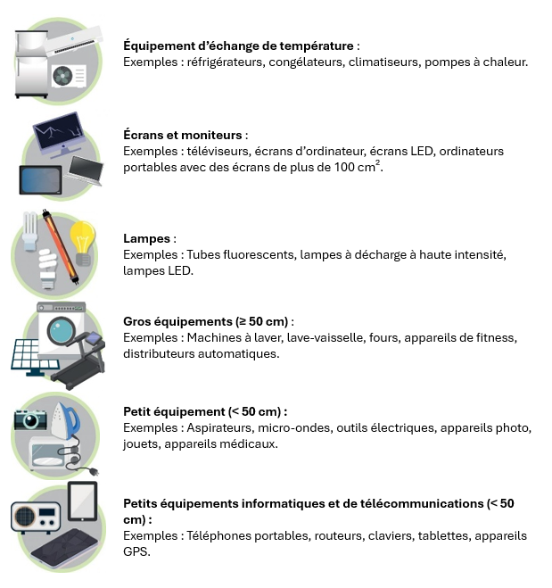 Les DEEE (ou déchets électroniques) désignent les Déchets d'Équipements Électriques et Électroniques et comprennent 6 catégories de produits :