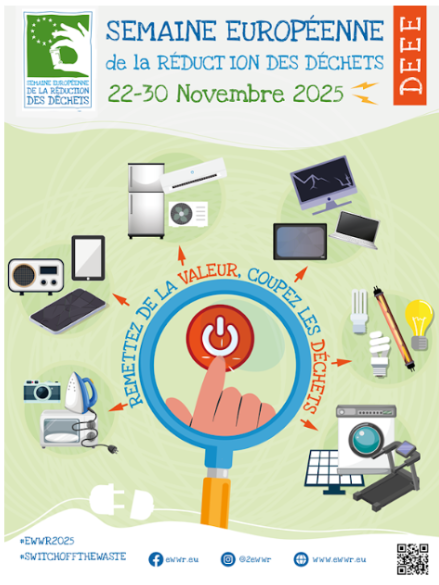 Cette année, la Semaine Européenne de la Réduction des Déchets s’étale sur une période allant du 22 au 30 novembre 2025 et se focalise sur les Déchets d’Equipements Electriques et Electroniques, plus communément appelés DEEE ou encore D3E avec un slogan « Remettez de la valeur, coupez les déchets ».