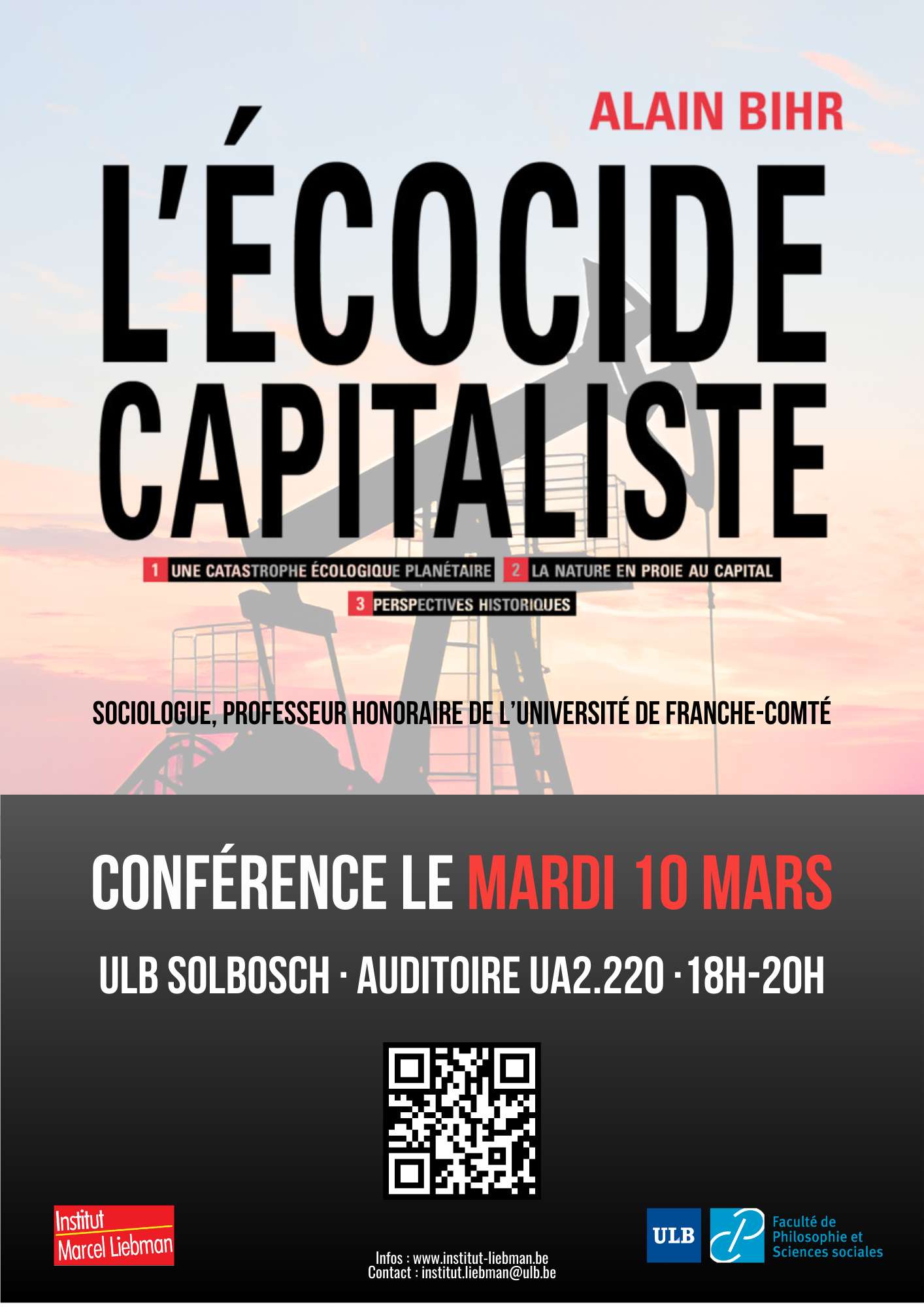 Le mardi 10 mars 2026 (18h-20h), l’Institut Marcel Liebman a le plaisir d’accueillir Alain Bihr pour une conférence autour de son dernier ouvrage L’écocide capitaliste (Syllepse / Page 2).